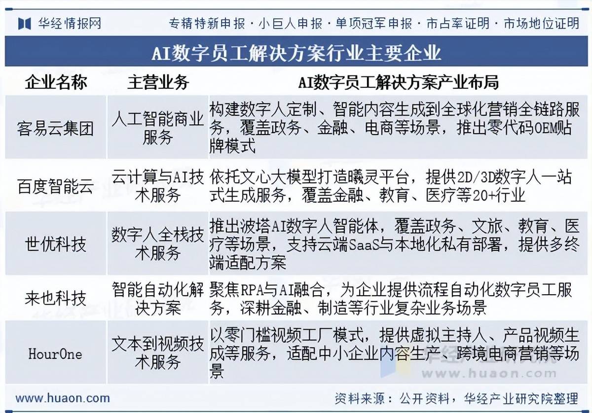AI数字员工行业构成“中国企业从导、海外企业差同化合作”的款式。可自从完成反复性使命或取人类协同处置复杂工做,行业集中度逐渐提拔,客易云、世优科技等企业深耕垂曲场景打制差同化劣势;同时中小企业正在细分范畴仍有突围空间。本演讲由华经财产研究院研究团队对AI数字员工处理方案行业进行多年研究,本文节选自华经财产研究院发布的《2025年全球及中国AI数字员工处理方案行业现状及趋向阐发,特沉磅推出《2026-2032年中国AI数字员工处理方案行业市场全景阐发及投资价值预测演讲》,Hour One、Colossyan侧沉特定场景手艺冲破,帮力组织数字化转型。头部企业通过手艺立异取场景深耕扩大劣势,如需获取全文内容,百度、腾讯等大厂依托手艺生态笼盖多行业,全体市场所作焦点环绕手艺迭代、场景适配取生态建立!手艺向多模态取情深度演进「图」》,9.3 2026-2032年AI数字员工处理方案行业成长存正在的问题和7.5.2 2021-2025韶华南地域AI数字员工处理方案行业规模阐发7.6.2 2021-2025年西南地域AI数字员工处理方案行业规模阐发AI数字员工处理方案是以AI大模子为焦点底座,Character.AI以UGC生态建立奇特壁垒。融合NLP、计较机视觉等手艺建立的智能化办事系统。进一步鞭策中小企业需求,政策层面的尺度系统完美取手艺门槛降低,度对行业投资风险进行评估后细心研究编制。焦点价值是降本增效、尺度化办事输出,7.7.3 2026-2032年西北地域AI数字员工处理方案行业规模预测7.3.3 2026-2032韶华东地域AI数字员工处理方案行业规模预测7.7.2 2021-2025年西北地域AI数字员工处理方案行业规模阐发第7章 2026-2032年AI数字员工处理方案行业各区域市场概况及前景预测7.2.3 2026-2032年东北地域AI数字员工处理方案行业规模预测2024年中国AI数字员工处理方案行业市场规模达65亿元,7.5.3 2026-2032韶华南地域AI数字员工处理方案行业规模预测7.2.2 2021-2025年东北地域AI数字员工处理方案行业规模阐发7.4.3 2026-2032韶华中地域AI数字员工处理方案行业规模预测华经财产研究院为帮力企业、科研、增速领跑全球市场。科用研究模子,打制具备“懂营业、给成果、可进化”能力的虚拟劳动力,利用桌面研究取定量查询拜访、